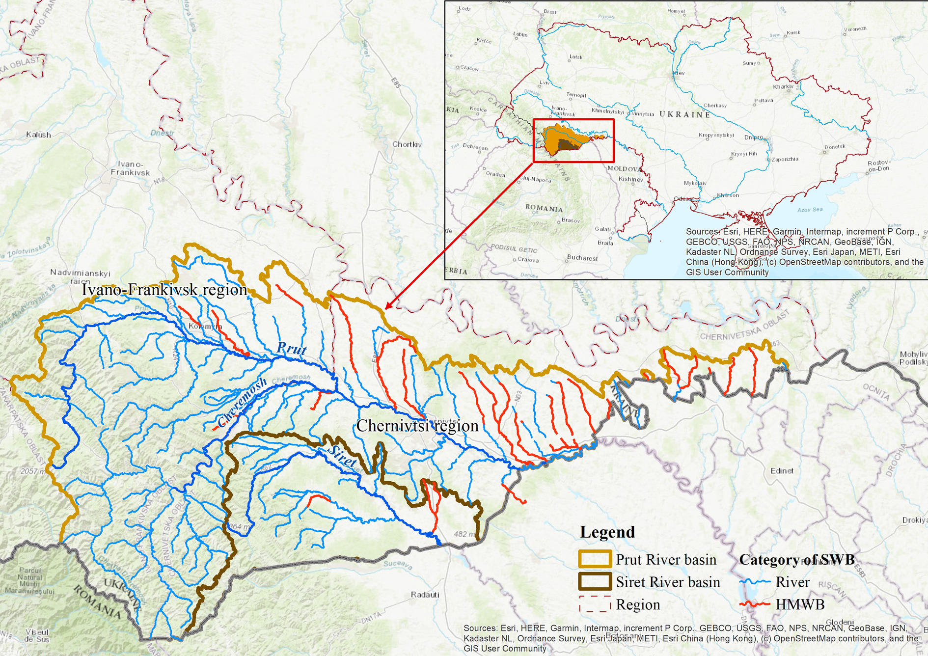 The Prut and Siret River basins are transboundary river systems located within the territories of Ukraine, Romania, and the Republic of Moldova. In Ukraine, the combined catchment area of these river basins is 11,430 km2, including 9,320 km2 for the Prut and 2,110 km2 for the Siret, accounting for approximately 36.3% of the Danube River Basin's total area within Ukrainian territory. The Prut River basin is located within the Ivano-Frankivsk and Chernivtsi regions of Ukraine. Its hydrographic network includes 113 rivers with catchment areas larger than 10 km2, as well as two reservoirs with storage capacities exceeding 1 million m3. The Siret River basin is entirely within the Chernivtsi region and includes 20 rivers with catchment areas exceeding 10 km2. There are no reservoirs with a volume exceeding 1 million m3. Together, the Prut and Siret River basins cover 1.9% of Ukraine’s total territory.