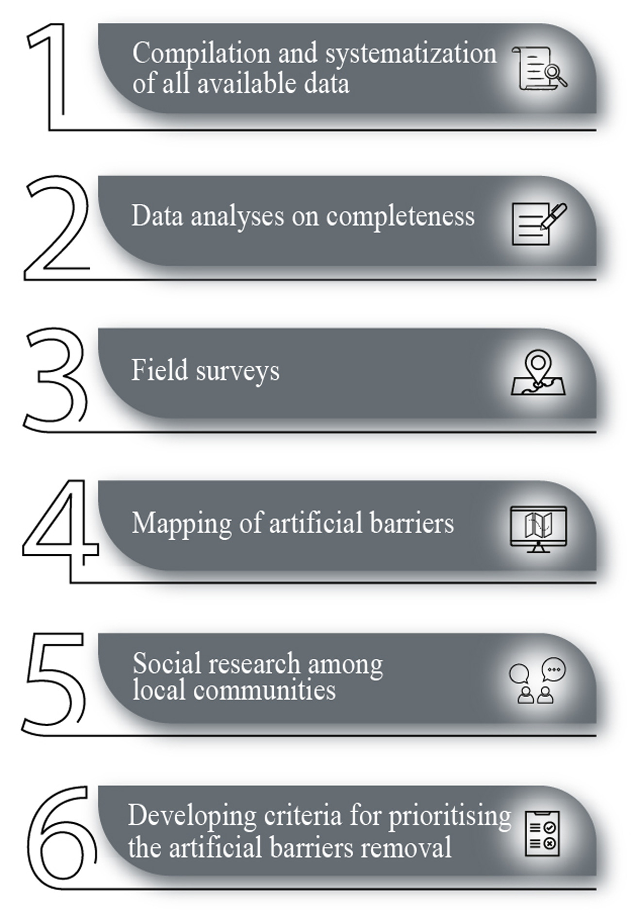 To support the planning, organization, and implementation of barrier removal measures, a step-by-step algorithm has been developed (Fig. 3). This algorithm is intended to assist the River Basin Management Authorities of Ukraine in systematizing and compiling all available data on in-channel barriers, as well as facilitating the development of management decisions aimed at improving the ecological status of surface water bodies, restoring the hydrological regime, and rehabilitating the hydromorphological characteristics of these water bodies.