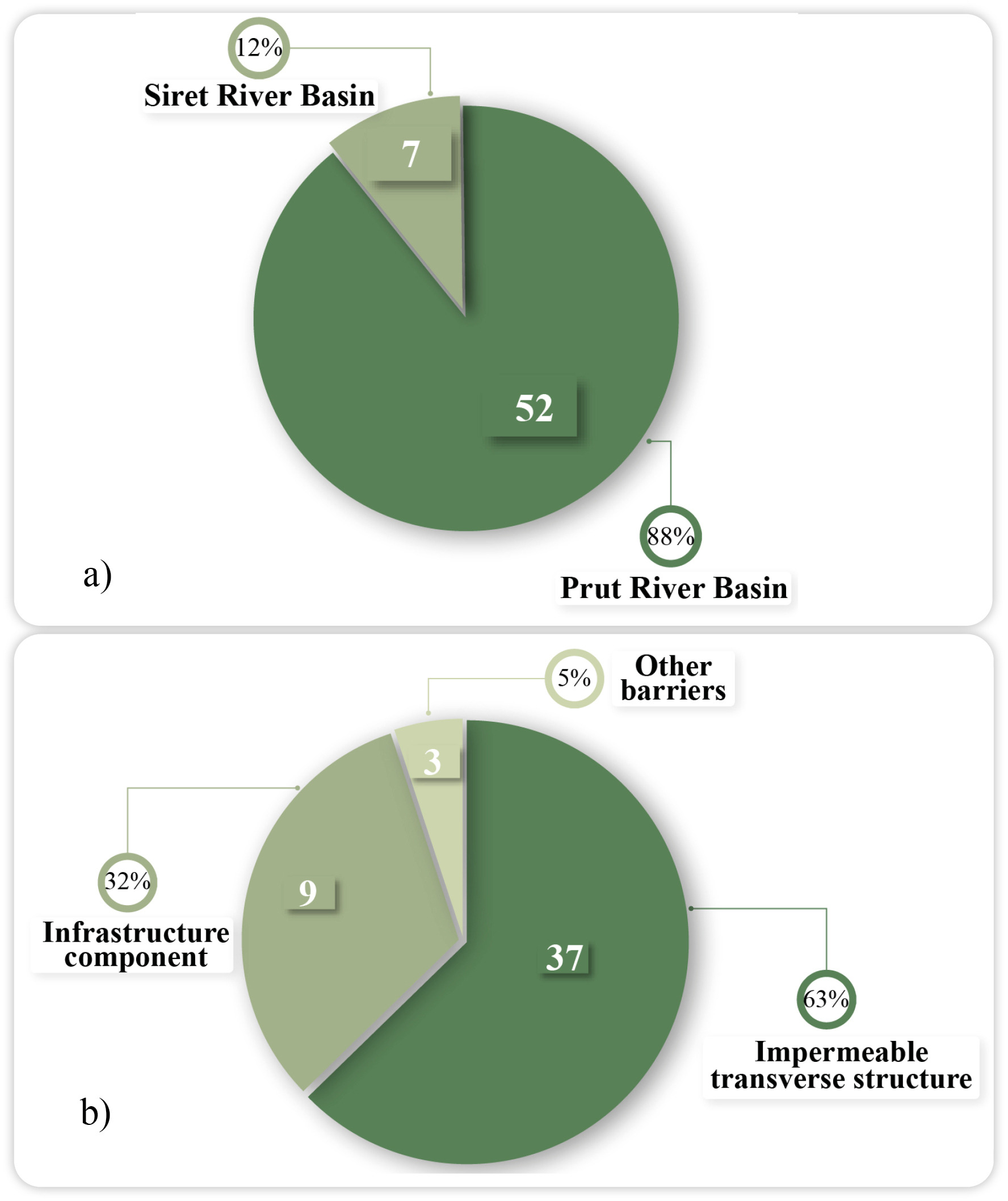 Distribution of identified barriers by the Prut and Siret River basins (a) and their distribution based on types (b).