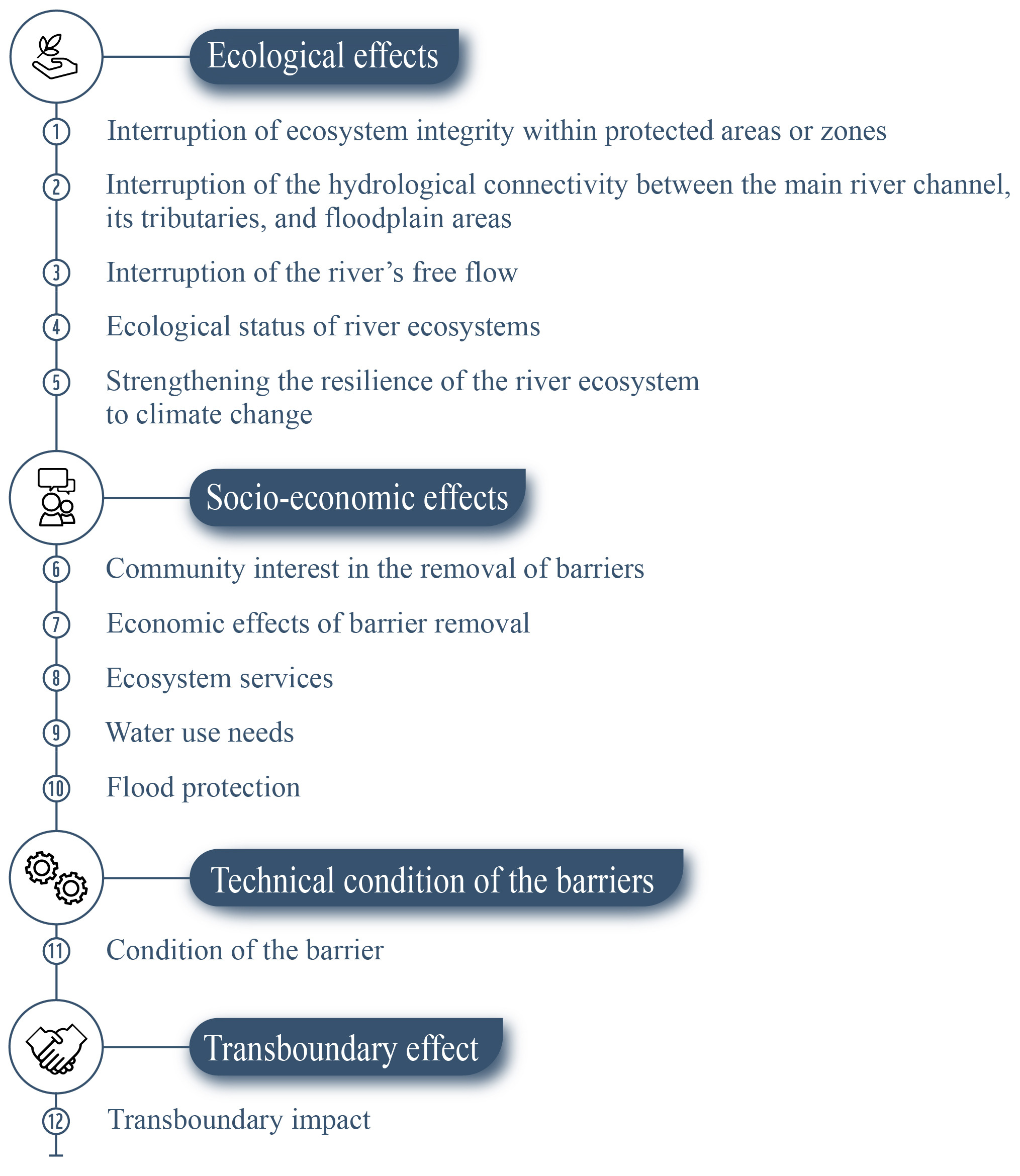 The removal of barriers that disrupt the free flow of rivers is a complex and multi-stage process, which includes careful planning, environmental impact assessments, public consultations, river ecosystem studies, etc. In addition, this process requires significant resources, both financial and human, so efforts should be primarily directed toward barriers whose removal will provide the greatest ecological and social benefits (Beechie et.al. 2008). For this purpose, criteria for prioritizing the removal of artificial barriers have been developed. When prioritizing the removal of artificial barriers, various factors must be considered, including water-use needs, protection against potential hazards to the population and adjacent territories, and the restoration of the river's free flow (Jumani et al. 2023).