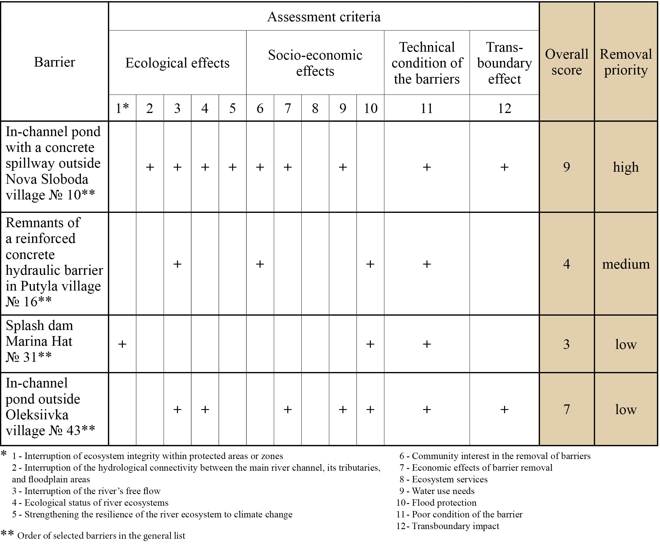 Thus, in the Prut and Siret River Basins, high removal priority was assigned to the dams and hydraulic structures of nine ownerless ponds, an old bridge in critical condition, and a road crossing the pond bed.