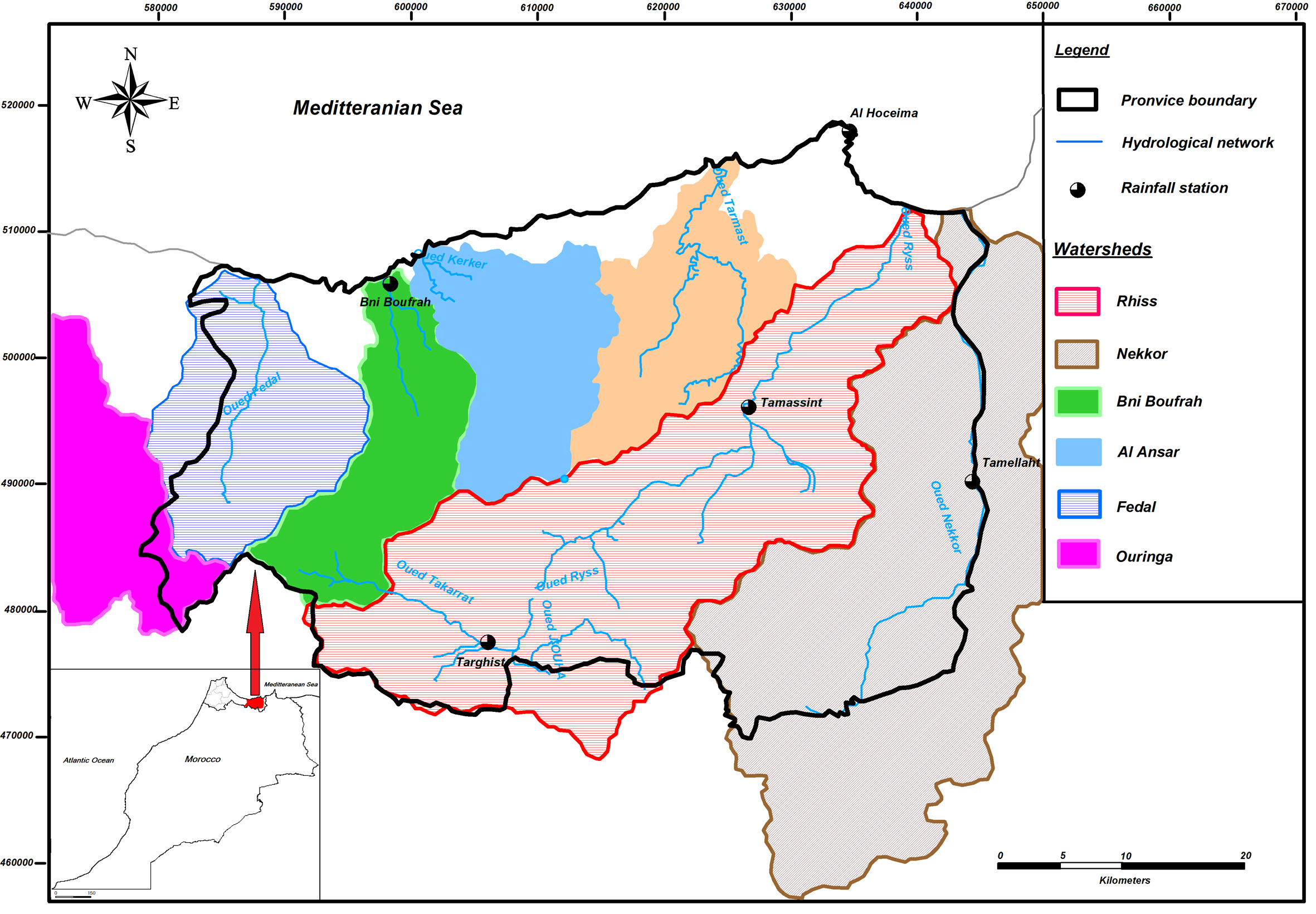 The Al Hoceima basin, located in the northern part of the Rif Mountains in Morocco (46°02’ – 51°08’N and 57°07’ – 64°06’E), covers a drainage area of 2315 km2 (Fig. 1). The river basin is divided into two major subbasins, Nekkour and Rhys, and three minor basins, El Ansar, Bni Boufrah, Feddal, and Ouringa. To collect meteorological data, five stations were strategically located to cover the whole region. Table 1 provides specific information on those stations, while Figure 1 shows the precise location of the study area and the hydrometric stations.