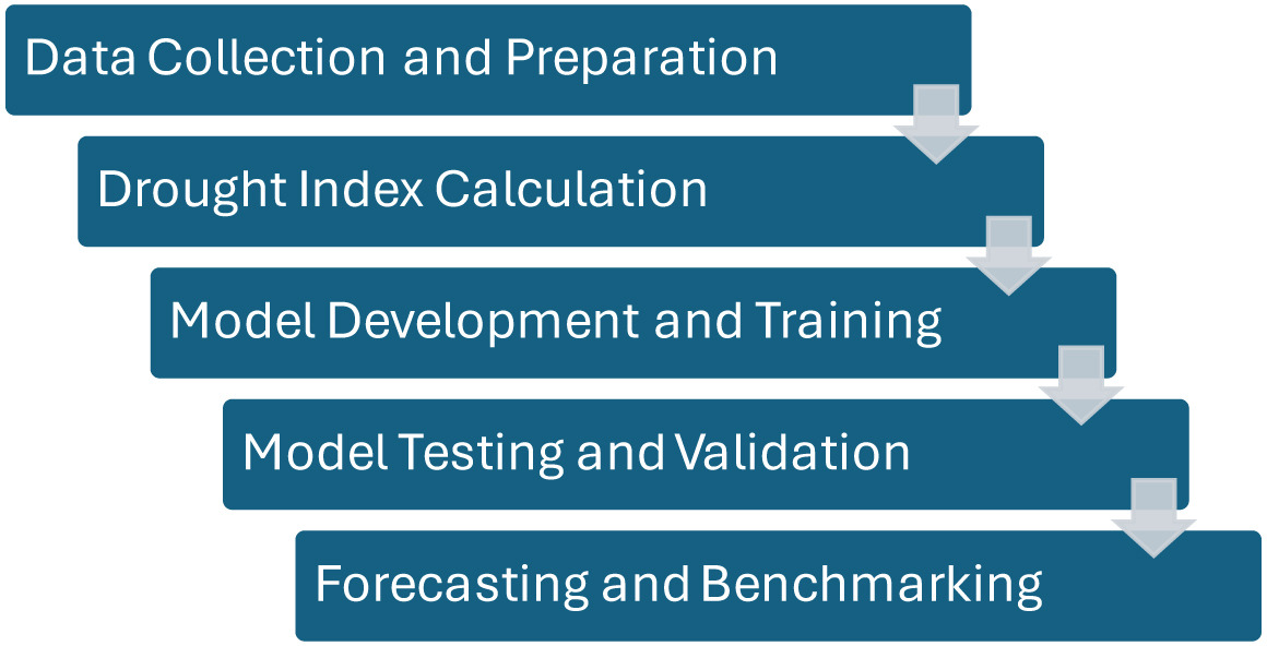 For monitoring, the Standardized Precipitation Index (SPI) has emerged as a key metric due to its statistical robustness and reliance solely on precipitation data, making it widely applicable and recommended (WMO 2012). It effectively identifies and quantifies drought severity and duration. Although the SPI excels at diagnosing past and current conditions, it is inherently descriptive, not predictive. Translating monitoring into actionable forecasting requires complementary modeling approaches.