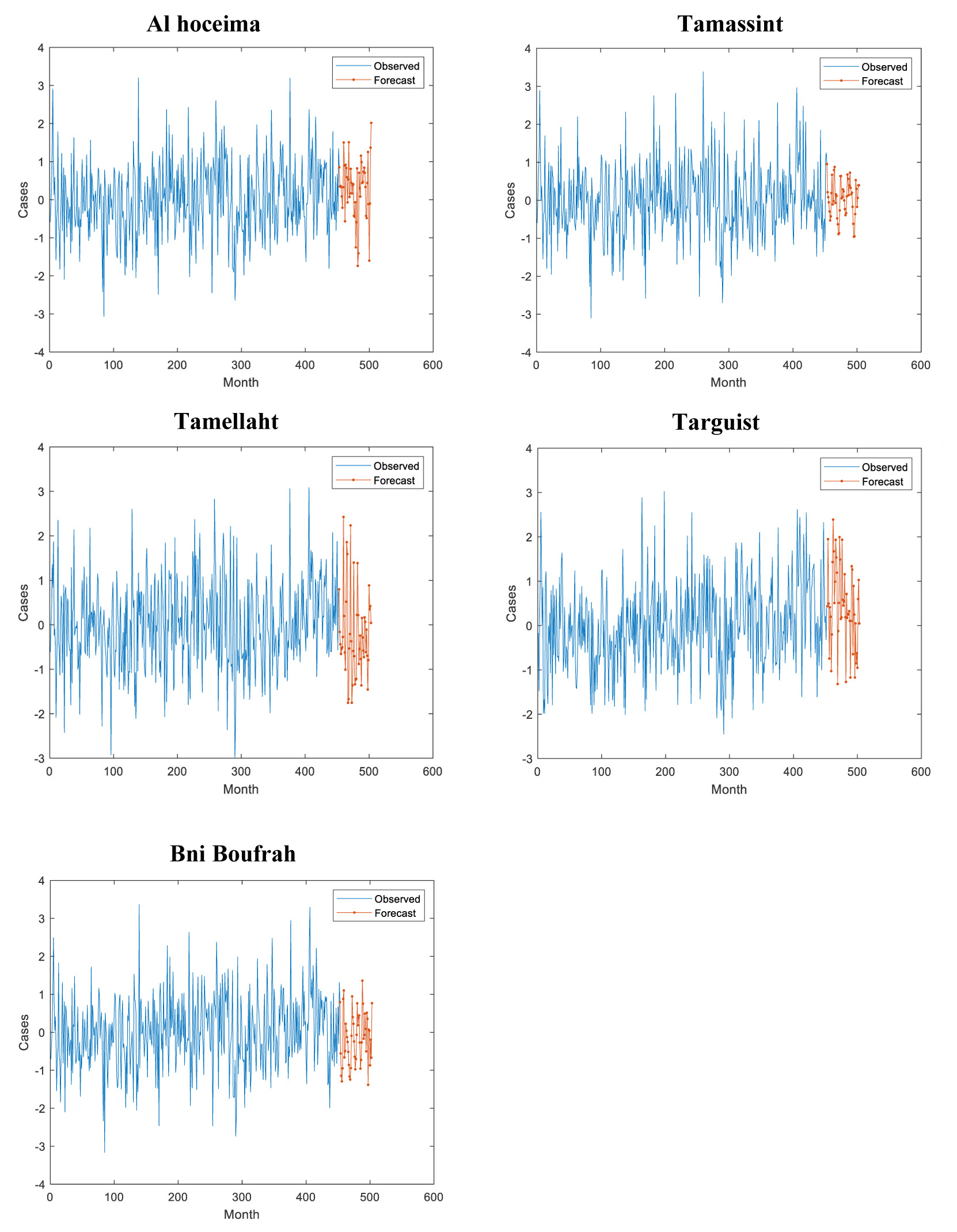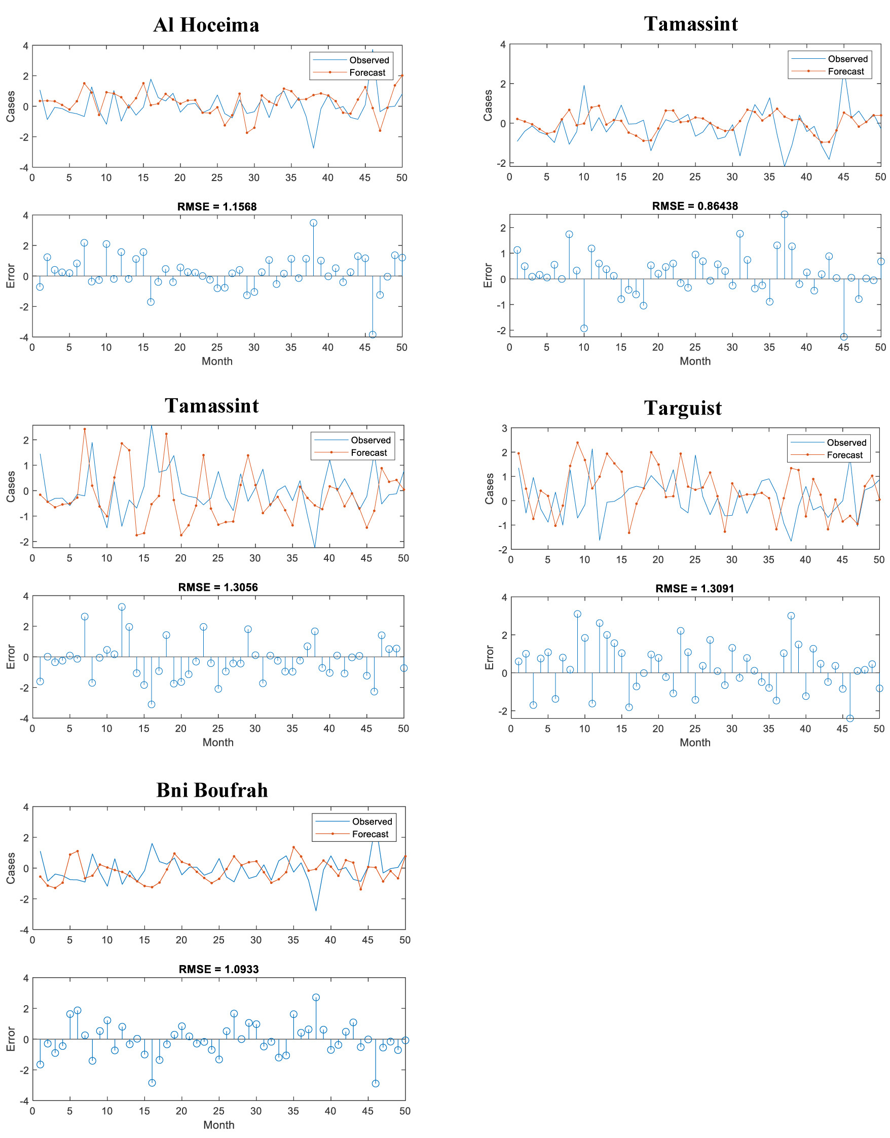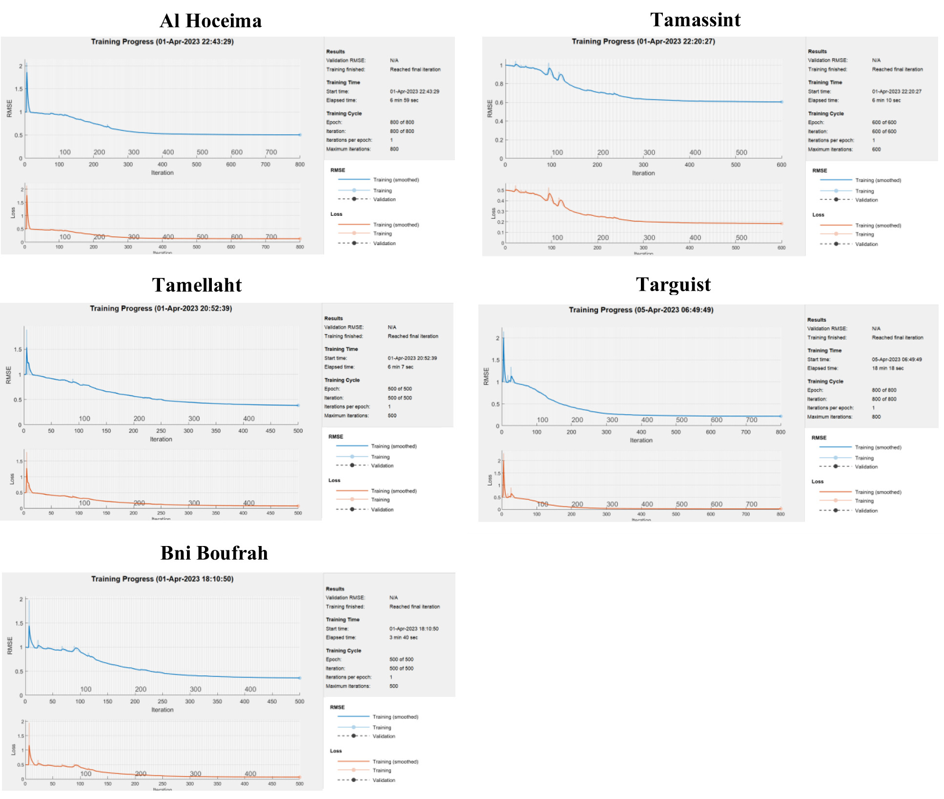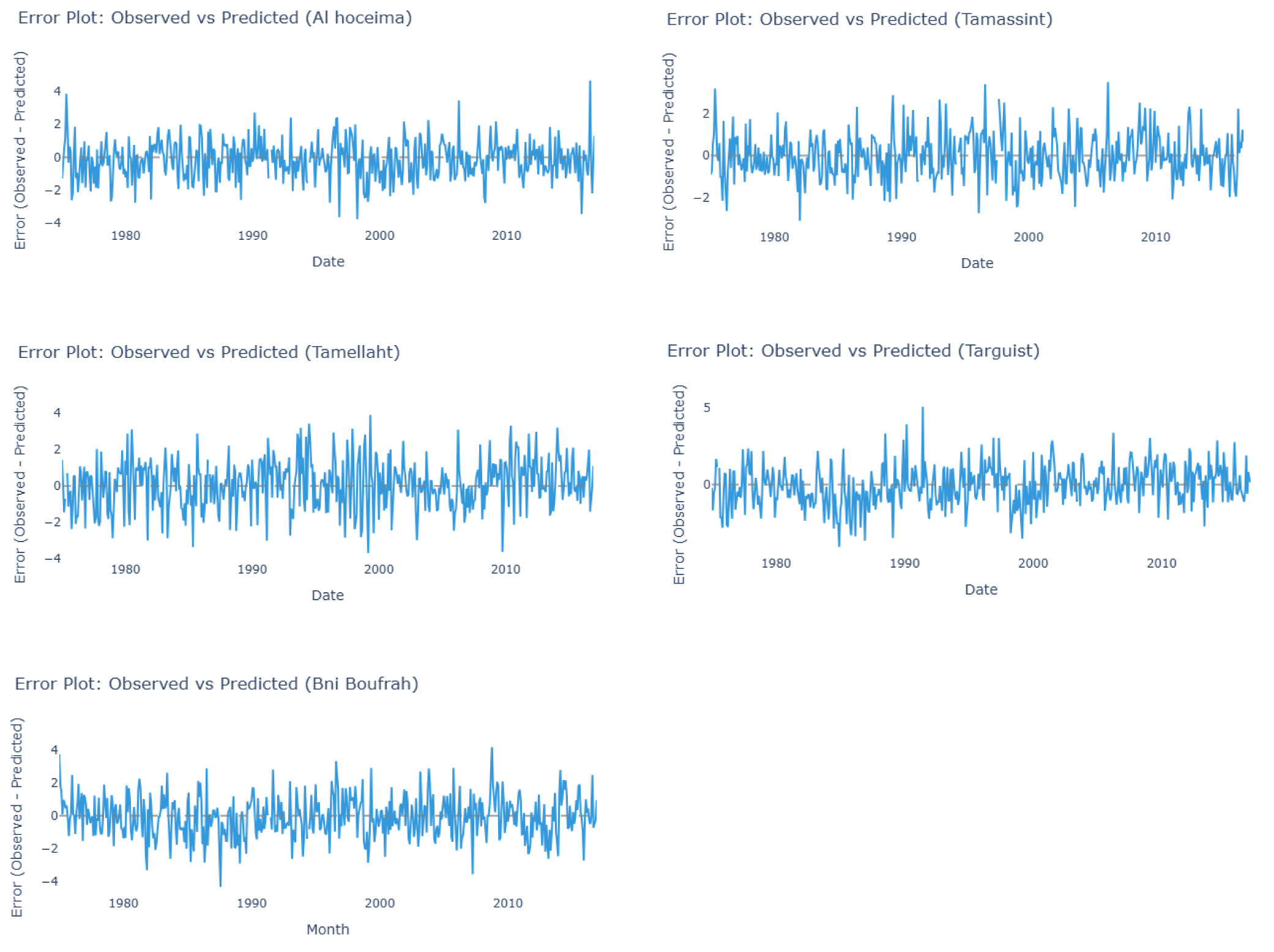 After obtaining satisfactory predictions using the test series, we validated the model on the entire data series. Figure 7 shows the error curve between the observed and predicted data. Acceptable errors are observed for all data from the five stations. The mean error ranges from 0.849 at the Tamassint station to 1.073 at the Tamellaht station, with a low standard deviation of 0.006 (El Hoceima) and not exceeding 0.802 (Tamellaht) (Table 7). The high correlation suggests that the model effectively captures the underlying patterns in the data.