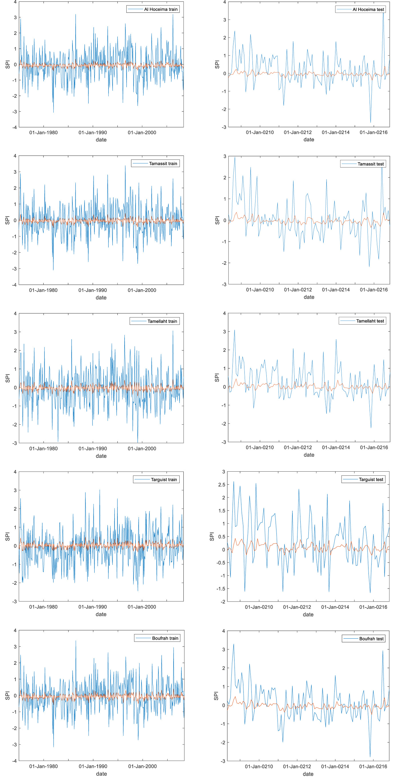 To validate our visual results, we measured the RMSE for the test data. It was found that the RMSE ranges from 0.86438 (Tamassint station) to 1.3091 (Targuist station), which is acceptable. The trained LSTM model may therefore be employed to forecast drought conditions, based on the estimated Standardized Precipitation Index (SPI), for the forthcoming months.