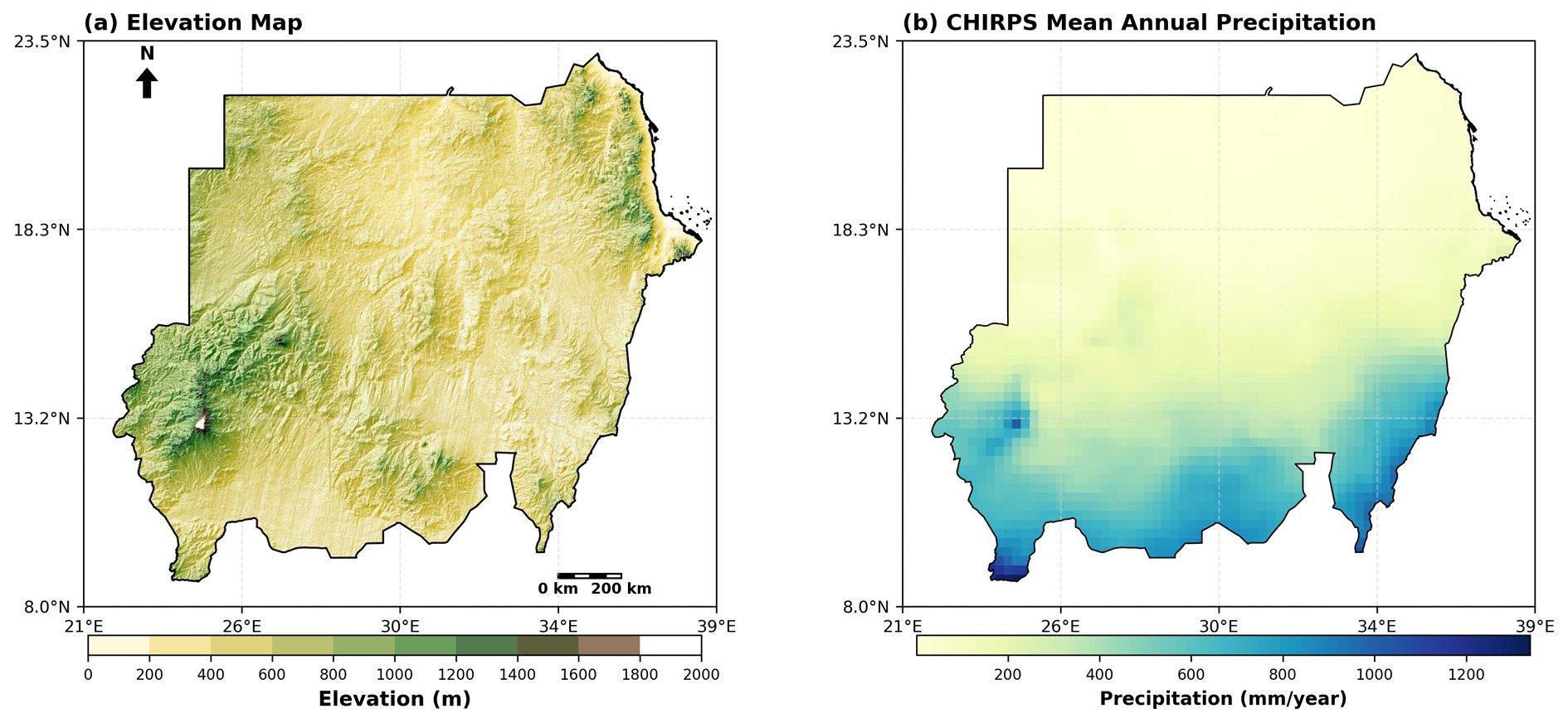 This study focuses on Sudan, the third-largest country in Africa, located between approximately 8°–23.5°N and 21°E–39°E. The country exhibits a pronounced climatic gradient, transitioning from hyper-arid desert conditions in the north to semi-arid and savanna environments in the south (Fig. 1), with elevation decreasing from the highlands in the east and south to the northern plains. Correspondingly, precipitation patterns are highly variable across the country, with northern regions receiving little rainfall and southern regions experiencing substantially higher totals, as shown by CHIRPS observations.