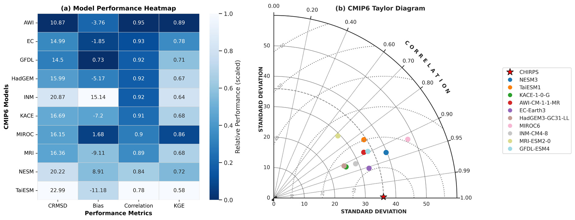 CMIP6 model evaluation over Sudan (1991-2014). (a) Model Performance Heatmap: centered root-mean- square difference (CRMSD), mean bias magnitude, Pearson correlation coefficient (r), and Kling–Gupta Efficiency (KGE) for raw precipitation simulations. Metrics were rescaled to 011 to allow direct comparison; lighter colours indicate better relative performance. Original unscaled values are annotated within each cell. (b) CMIP6 Taylor Diagram: standard deviation, correlation coefficient, and CRMSD of each model relative to CHIRPS observations. Models closer to the reference point (CHIRPS) exhibit higher agreement in precipitation pattern and magnitude. EC-Earth3 achieved the highest correlation and lowest CRMSD, whereas MRI-ESM2-0 displayed the lowest correlation and highest CRMSD among the evaluated models.