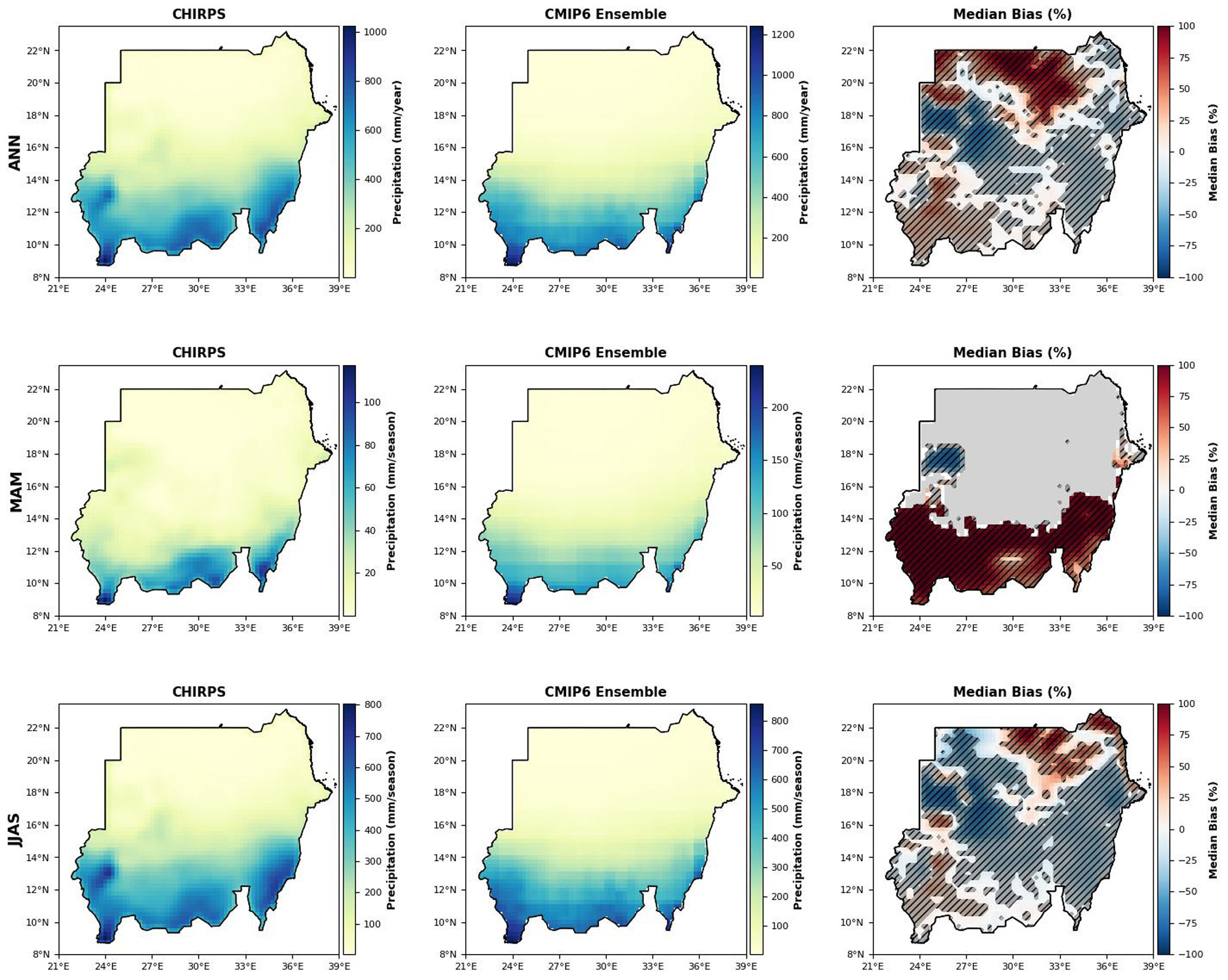 Seasonal precipitation over Sudan for the annual (ANN), pre-monsoon (March-May; MAM), and monsoon (June-September; JJAS) seasons during 1991-2014. Panels from left to right show CHIRPS observations, raw CMIP6 ensemble mean precipitation, and the corresponding median bias (CMIP6 − CHIRPS) in percent (%). Hatching indicates areas where the bias is statistically significant (p < 0.05), determined using two-sample t-tests.