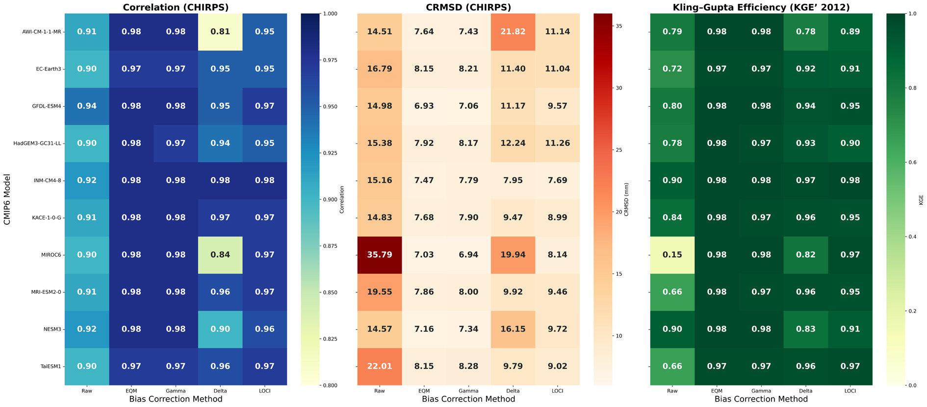 Heatmaps illustrating Pearson correlation coefficient, Centered Root Mean Square Difference (CRMSD), and Kling–Gupta Efficiency (KGE) for ten CMIP6 climate models before and after bias correction by LOCI, Delta, EQM, and Gamma methods. Results are benchmarked against CHIRPS observations over Sudan (annual mean, 1991-2014). Superior performance is indicated by higher correlation and KGE, and lower CRMSD values, with EQM and Gamma methods showing consistently better skill.