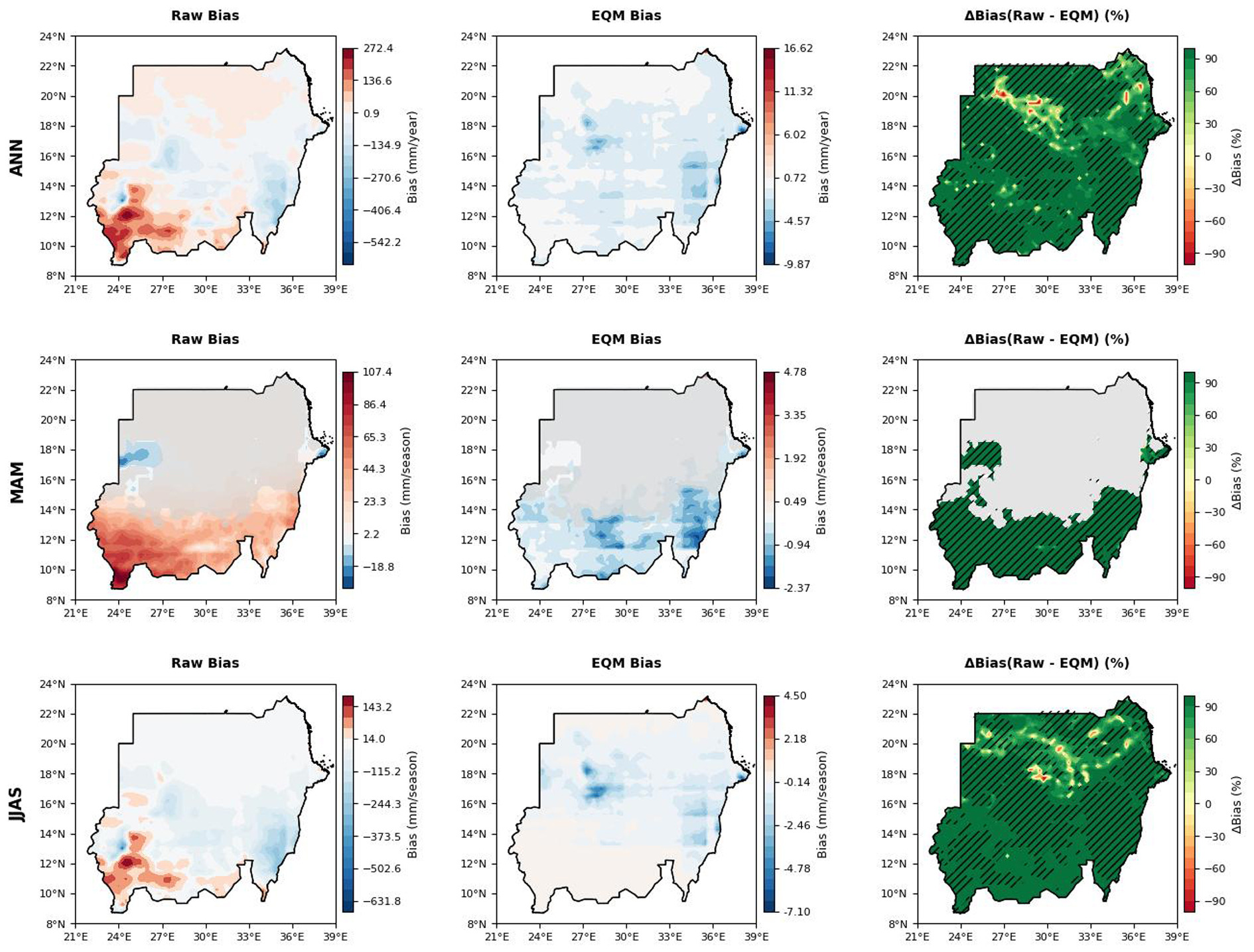 Spatial distribution of annual and seasonal precipitation biases over Sudan (1991-2014) for the ensemble raw CMIP6 simulations and EQM bias-corrected outputs. Columns represent (from left to right) the raw bias, EQM-corrected bias, and the percentage reduction in bias (ΔBias %) following EQM correction. Units are mm/year for the annual (ANN) row and mm/season for seasonal rows (MAM: March–May, JJAS: June–September). Grey shading in MAM highlights arid northern and central regions with observed precipitation below 10 mm/season, excluded from the ΔBias calculation. Hatching indicates areas where bias reduction is statistically significant (p < 0.05).