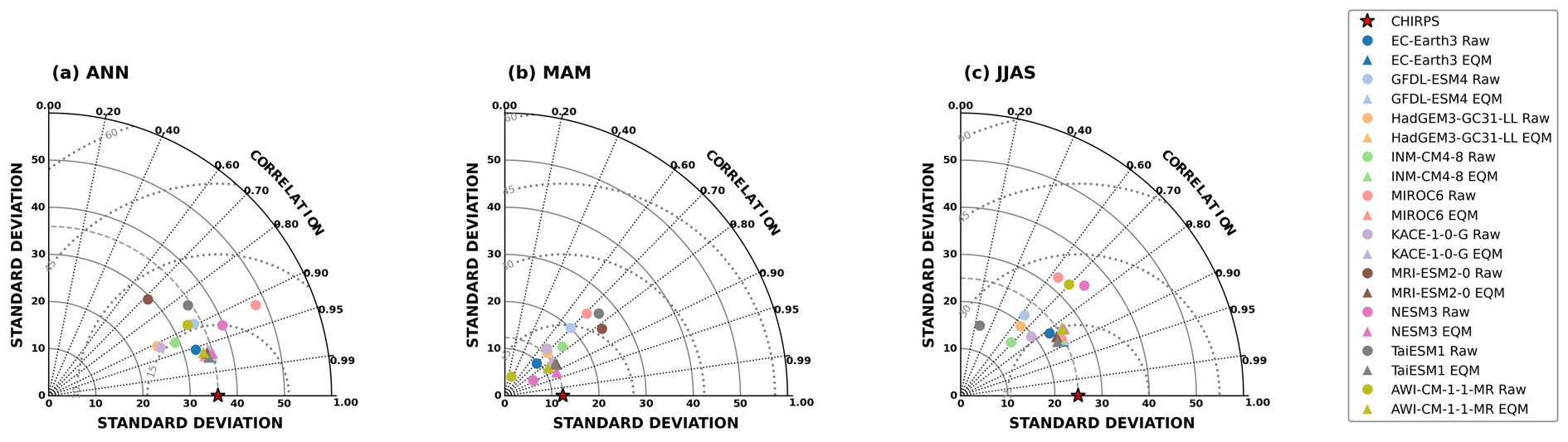 Taylor diagrams for ten CMIP6 models before and after EQM bias correction during (a) annual, (b) March-May, (c) June-September. Each diagram compares model performance with CHIRPS precipitation over Sudan in terms of correlation (radial distance), CRMSD (curved distance from the reference point), and standard deviation (distance from the origin). Star markers denote CHIRPS; circles represent raw models; triangles represent EQM-corrected models.