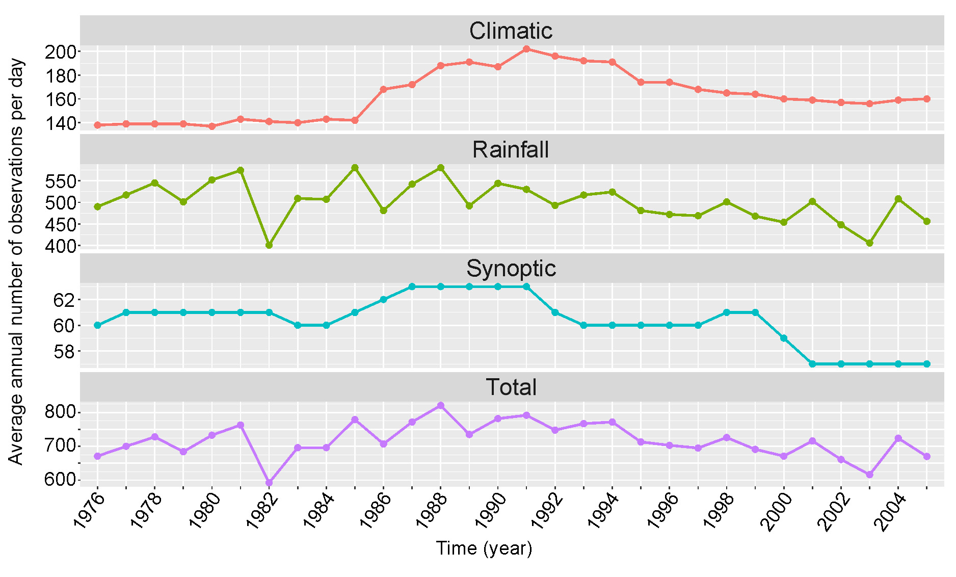 The average annual amount of data for one day from 1976-2005 for climatic, rainfall, synoptic, and total observations.