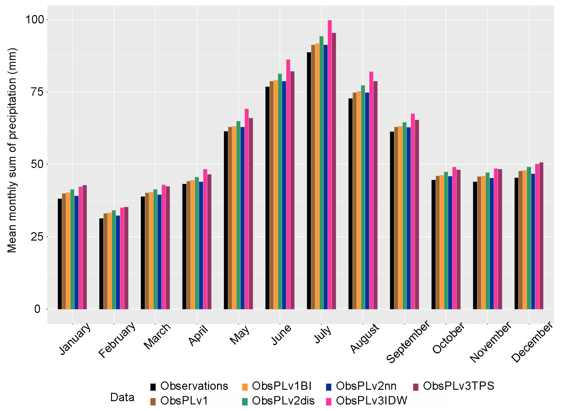 Based on the calculated 30-year average monthly sum of precipitation, the annual cycle of the monthly sum is presented in Figure 4. The overall assessment was positive for all models, and they all maintained the annual cycle. However, when calculating the percentage errors (in relation to the mean values for the observations) of the monthly averages, there was a division into two groups for better (methods v1, v1BI, v2nn) or worse (methods v2dis, v3IDW, v3TPS) reproduction of the annual cycle (Fig. 5). The lowest percentage error was achieved for the v2nn method for all months below 5%, and the highest for v3IDW for all months above 10%.