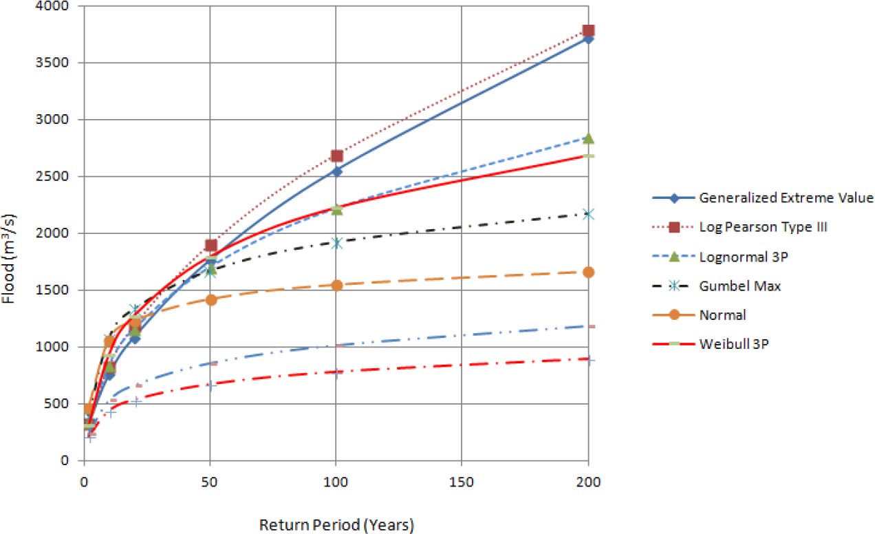 To select the best fit probability distribution, first of all, alternative probability distribution models need to be analyzed. Continuous probability distributions used in the hydrology sector, including generalized extreme value, Gumbel maximum, log Pearson type III, log Normal (3P), normal, and Weibull 3P were fitted to the processed flood data. The regional empirical methods Hydest and Modified Hydest were used for predicting discharges for different return periods.