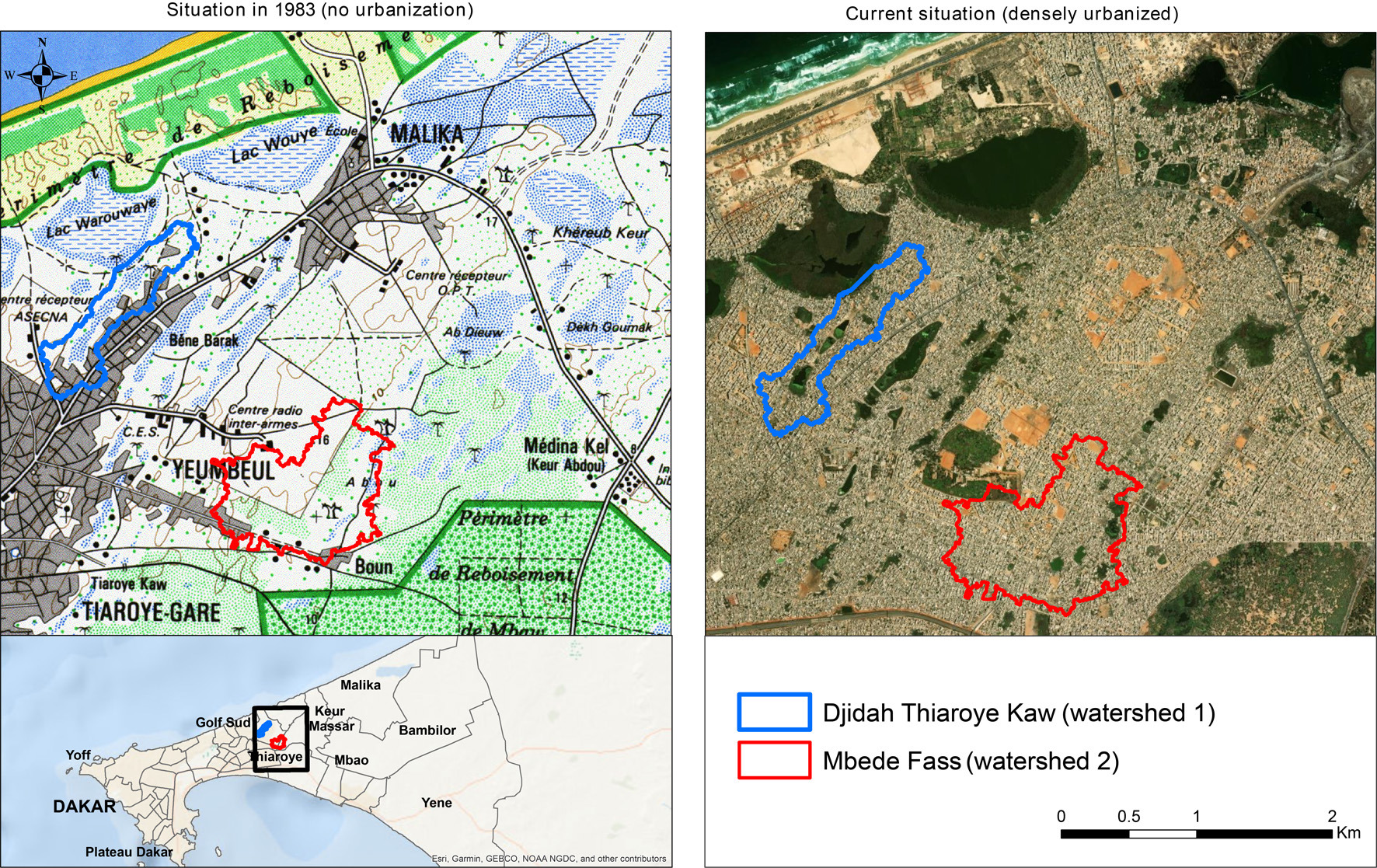 The study area is located on the outskirts of Dakar, within a context of rapid and dense urbanization over the past several decades (Sané 2013), which has significantly disrupted local hydrological functioning (Diop et al. 2018). The annual rainfall ranges from 400 to 600 mm (Mendy 2023) over predominantly sandy soils, with hydromorphic characteristics around low-lying areas linked to a shallow groundwater table (Faye et al. 2019). The flat topography, combined with predominantly sandy and highly permeable soils, naturally limits surface runoff; however, increasing imperviousness and the limited efficiency of drainage systems amplify runoff volumes (Schaer et al. 2018). Two small urban catchment areas (50-107 ha) were selected to illustrate contrasting urbanization trajectories around the area. Catchment 1 (Djidah Thiaroye Kaw) is characterized by dense urbanization that began in 1983 with the gradual occupation of former runoff channels and natural depressions. Catchment 2 (Mbede Fass) illustrates rapid informal urbanization since the 1990s and shows mixed urbanization (planned and unplanned) leading to the disappearance of wetlands (Fig. 1).