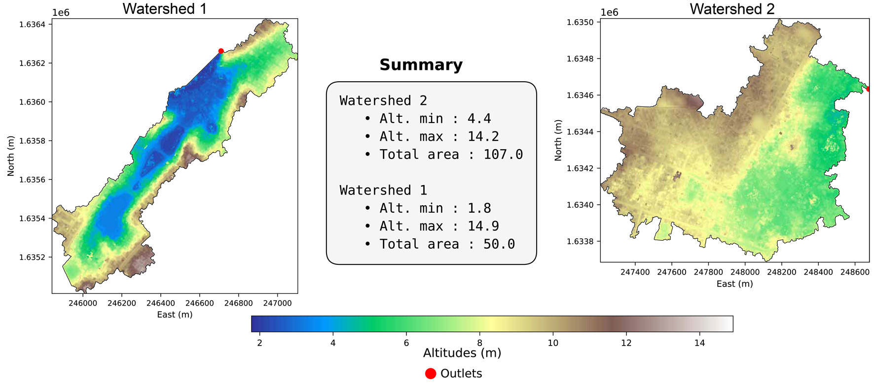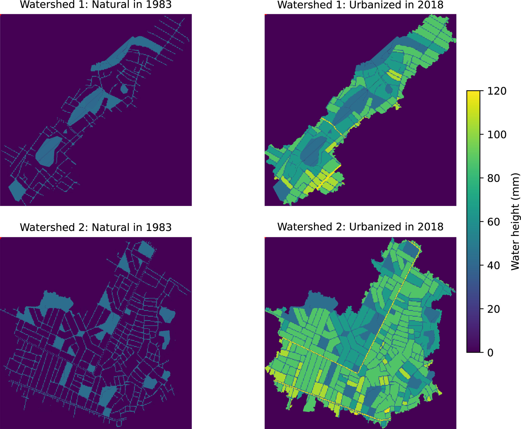 Both land-use scenarios were subjected to the same rare-event rainfall hyetogram (100-year return period) to isolate the effect of urbanization changes on the two catchments. Model outputs include simulated water depths for each natural or urban grid cell (Fig. 5) as well as flow hydrographs computed at the catchment outlets (Figs. 6 and 7).