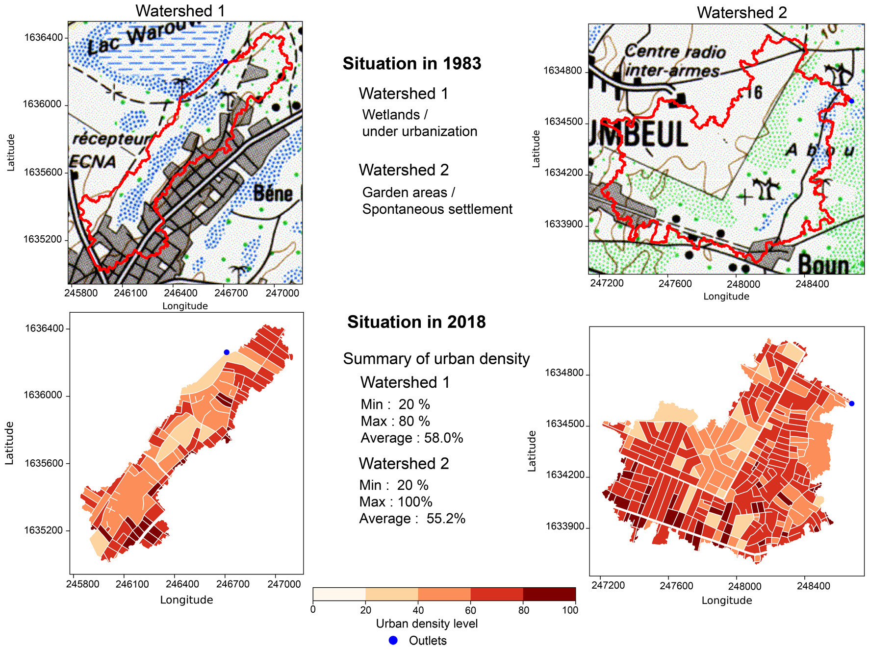 Urban development was analyzed using land-use data from 1983 and 2018. For the 1983 reference state, the urbanization rates of the two catchments were estimated from city topographic maps (IGN, scale 1:25,000) and available aerial photographs, using visual interpretation and digitization of built-up areas. Although these historical maps do not allow a detailed characterization of urban density, they provide a sufficiently reliable representation of the spatial extent of urbanized areas, estimated at less than 20% in watershed 1 and less than 10% in watershed 2. For the 2018 situation, the analysis relied on cadastral data from the Dakar urban database provided by the DPGI. These building-level data were aggregated to the urban block scale to quantify built-up density within the urban blocks of each catchment. Density rates, defined as the ratio of built-up area to total block area, averaged 58% in watershed 1 and 55.2% in watershed 2 (Fig. 3).