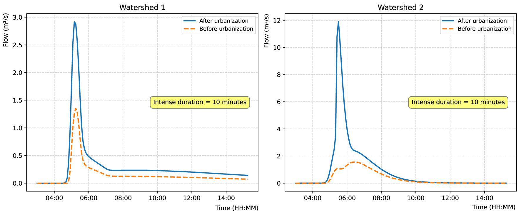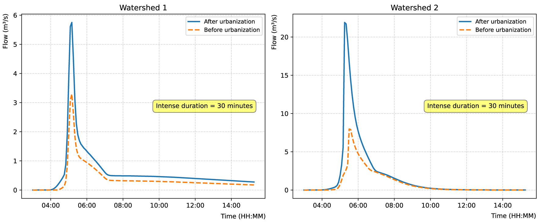 Comparison of hydrographs for a 30-minute peak intensity of a 100-year return period rainfall event.