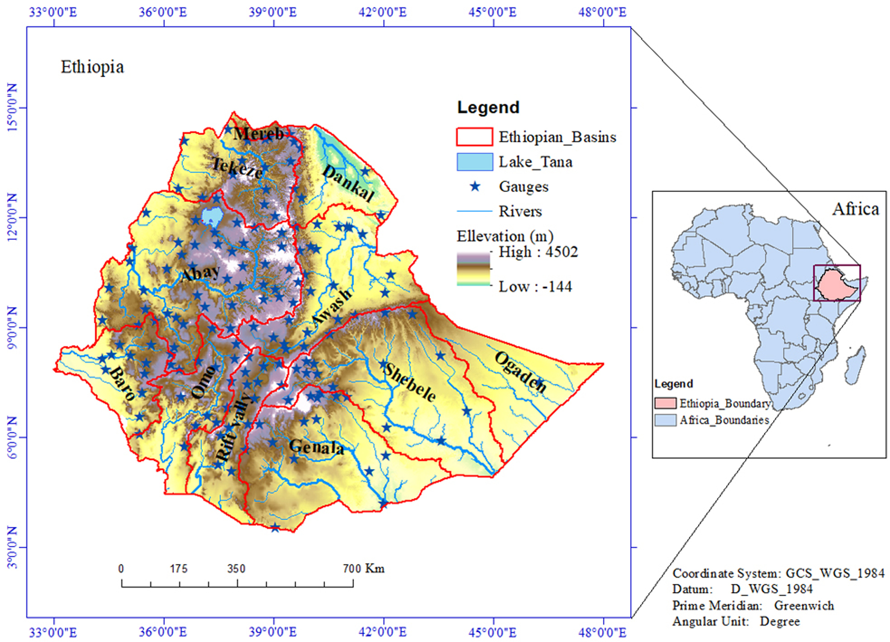 Ethiopia, spanning approximately 1.13 million km2 between 3.30°–15°N and 33°–48°E, is characterized by diverse and complex topography, including highlands, rugged terrain, low plains, and the Great Rift Valley, which divides the country into distinct regions (Fig. 1). Elevations range from 144 m below sea level in the Danakil Depression to 4,620 m asl at Ras Dashen peak (Awulachew et al. 2007). This varied terrain contributes to significant spatial and temporal climate variability, including diverse rainfall regimes (Abbate et al. 2015; Fazzini et al. 2015; Camberlin 2018). The country is divided into several major river basins that differ in size, flow, and elevation, with the Abay (Upper Blue Nile) Basin being the most prominent in terms of flow and tributaries, while the Rift Valley Basin is the smallest, yet known for its numerous lakes (Williams 2016).