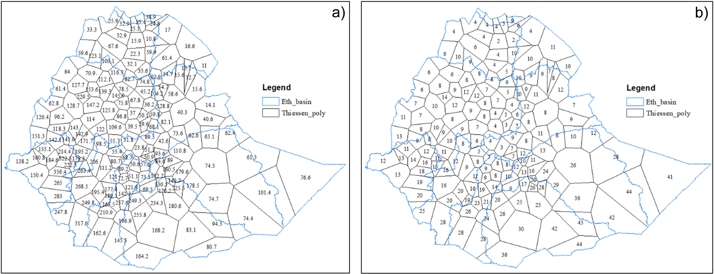 (a) Spatial distribution of mean Belg seasonal precipitation and (b) its percentage contribution to annual rainfall, based on gauge observations and corresponding Thiessen polygons.
