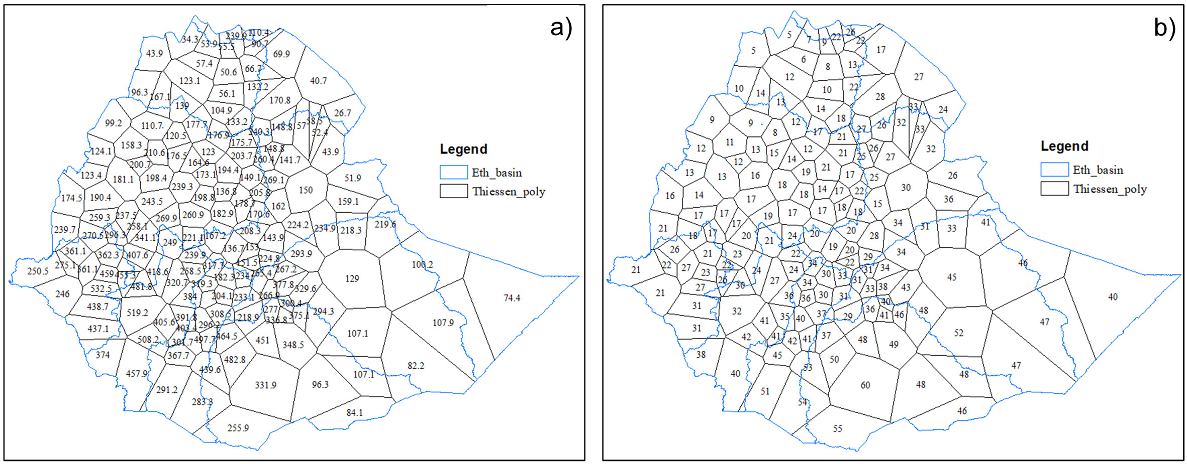 Areal mean rainfall for each basin was estimated using the Thiessen polygon method (Thiessen 1911; Mair, Fares 2011). This method assigns weights to each gauge based on the area it represents, assuming that rainfall within each polygon is best represented by the gauge located at its centroid.