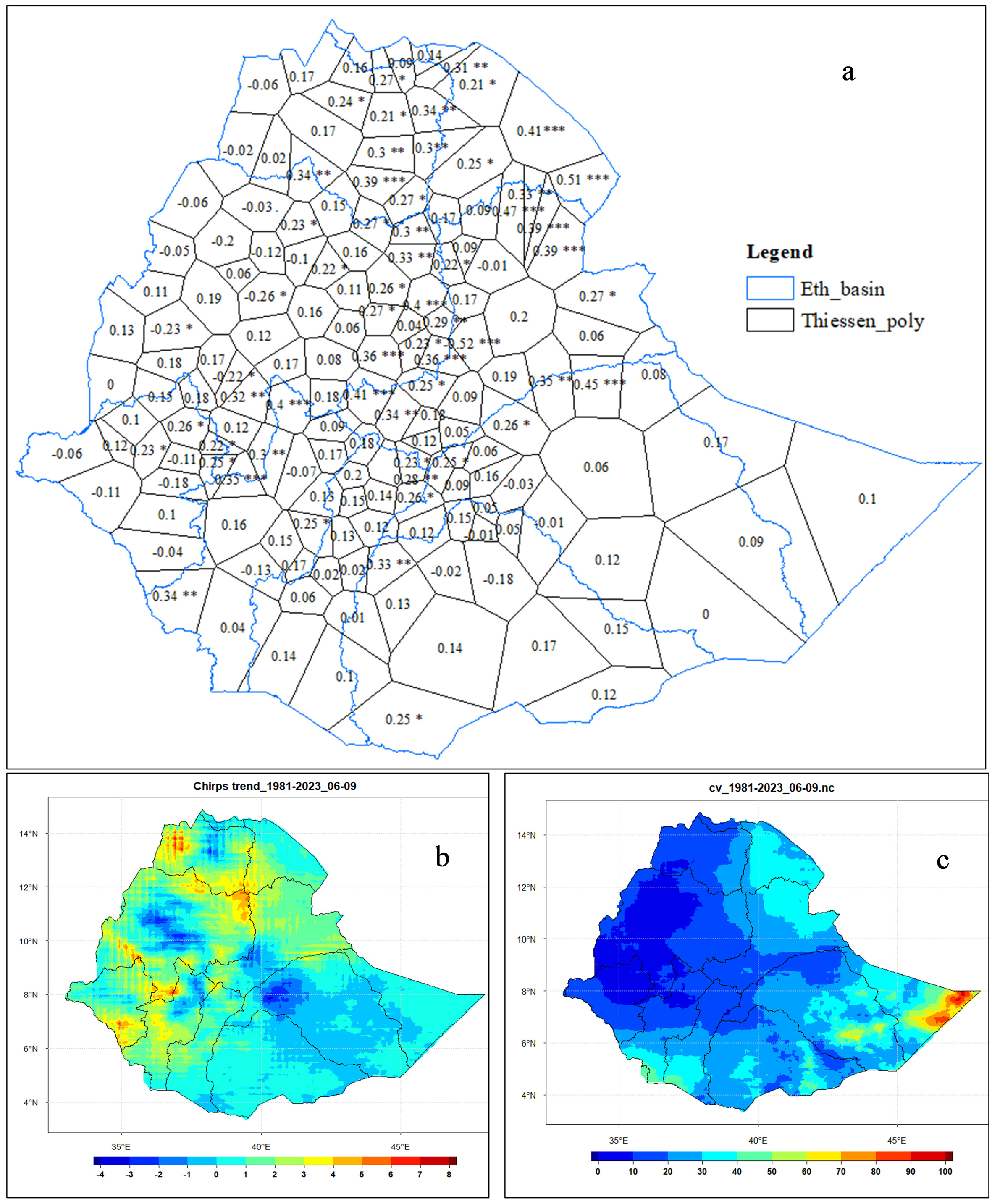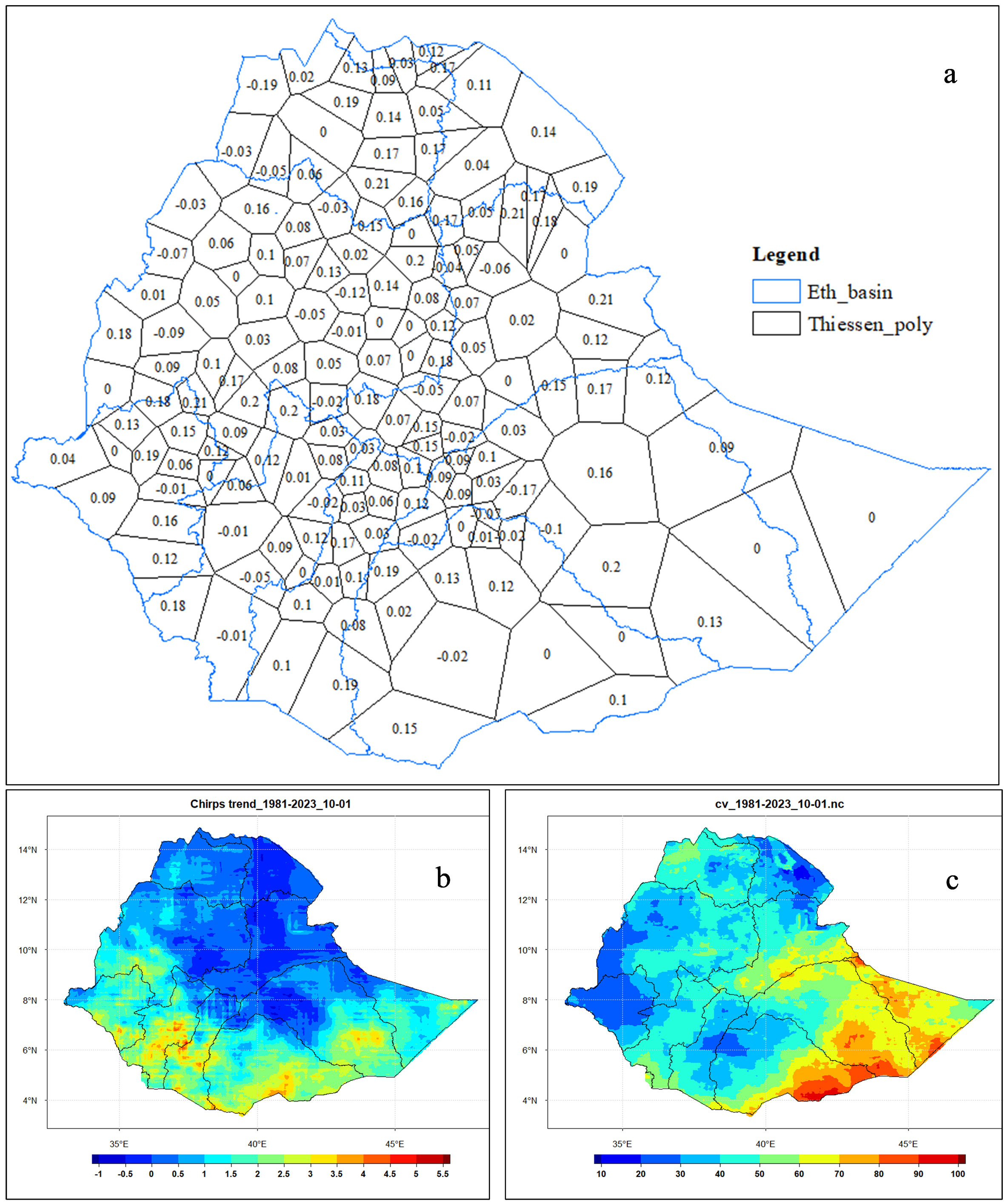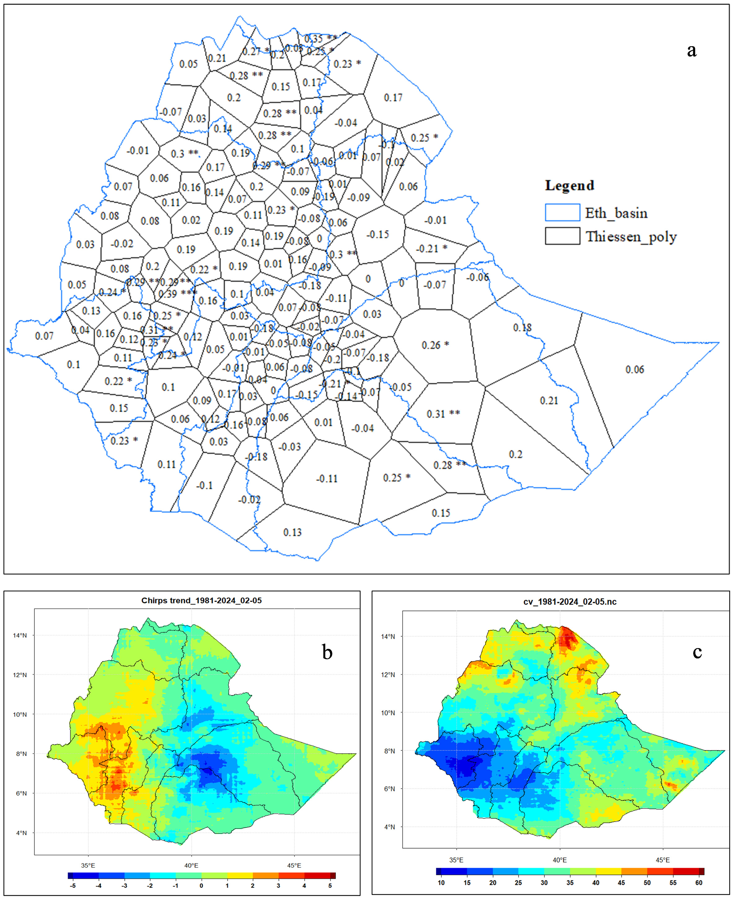 (a) Belg areal mean precipitation trends based on gauge observations shown using Thiessen polygons and Kendall’s Tau values, (b) corresponding CHIRPS-based precipitation trends (mm yr-1), and (c) the coefficient of variation.