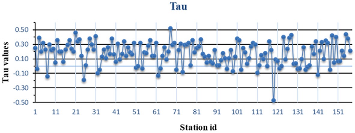 Modified Mann–Kendall test Tau values for annual precipitation (1981-2023) based on 158 rain gauge stations.