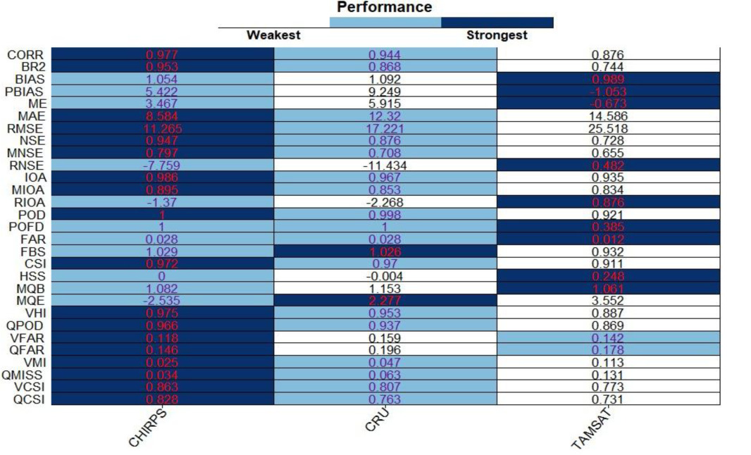 Among the three datasets, CHIRPS showed the best overall agreement with gauge data across most metrics (Table 1).